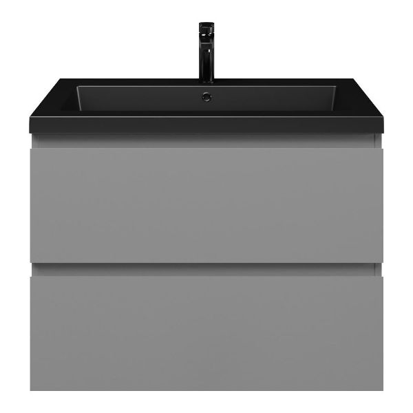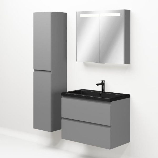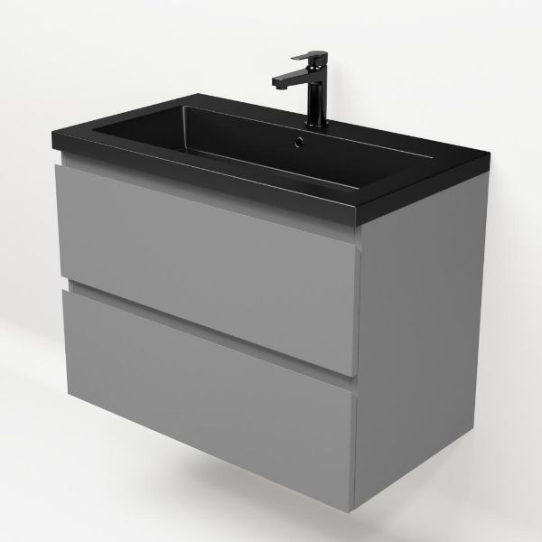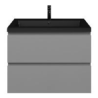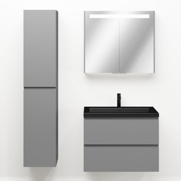 Greeploos badkamermeubel in de kleur licht grijs mat is 80 cm breed. De wastafel is vervaardig in polystone en heeft de kleur zwart mat keramiek. Dit badkamermeubel met deze wastafel is leverbaar tussen de 60 cm t/m 200 cm