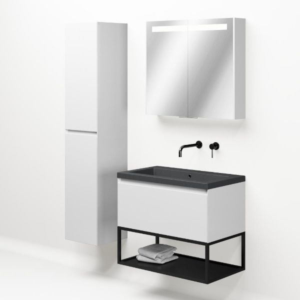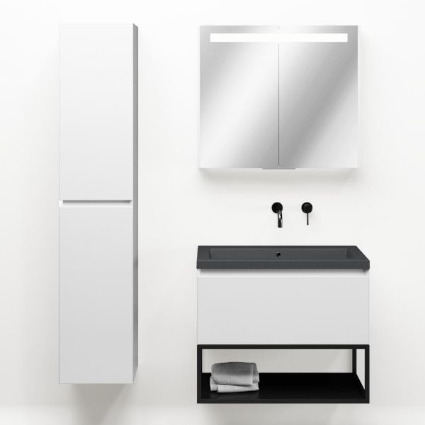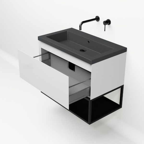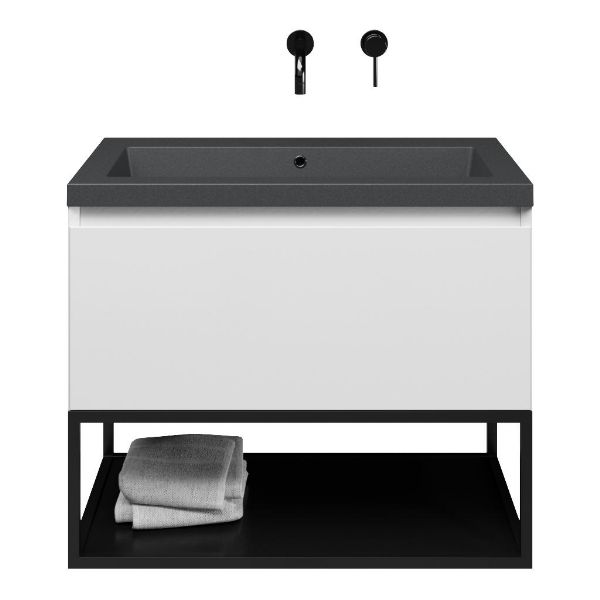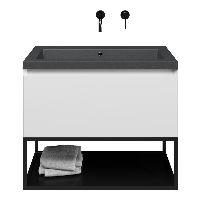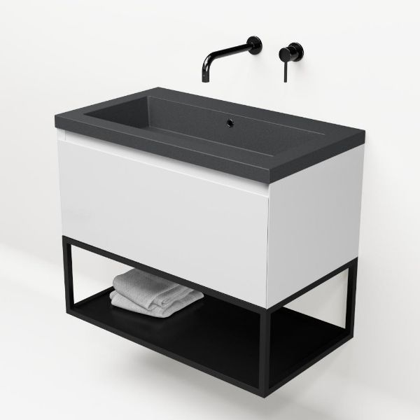 | Bellanti Solo/Tela/Esta-Q badmeubel 80x46 1 softclose lade wit hoogglans greeploos quartz wastafel mat grijs zonder kraangaten met mat zwart metalen frame |
