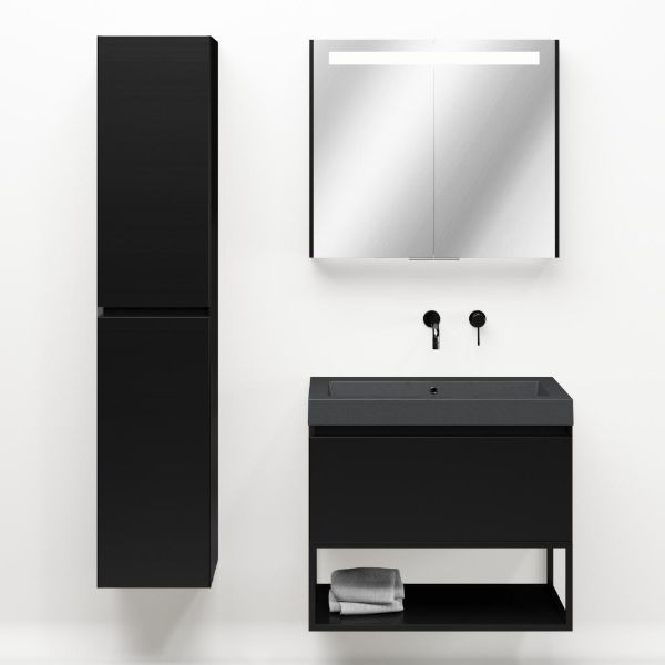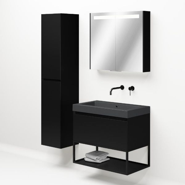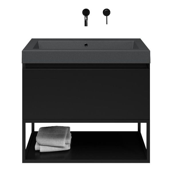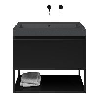 | Bellanti Solo/Tela/Esta-Q badmeubel 80x46 1 softclose lade zwart mat greeploos quartz wastafel mat grijs zonder kraangaten met mat zwart metalen frame |