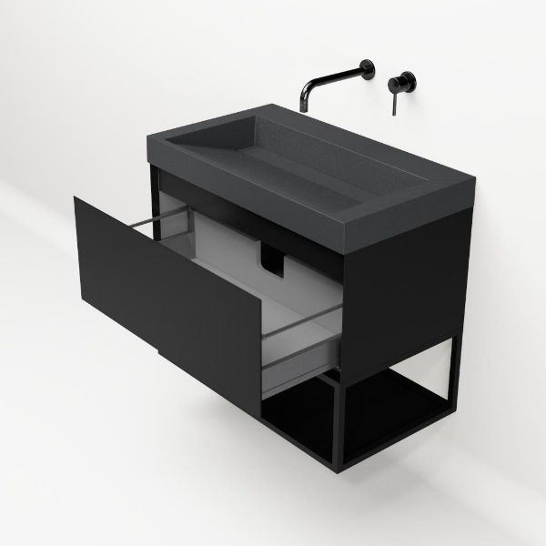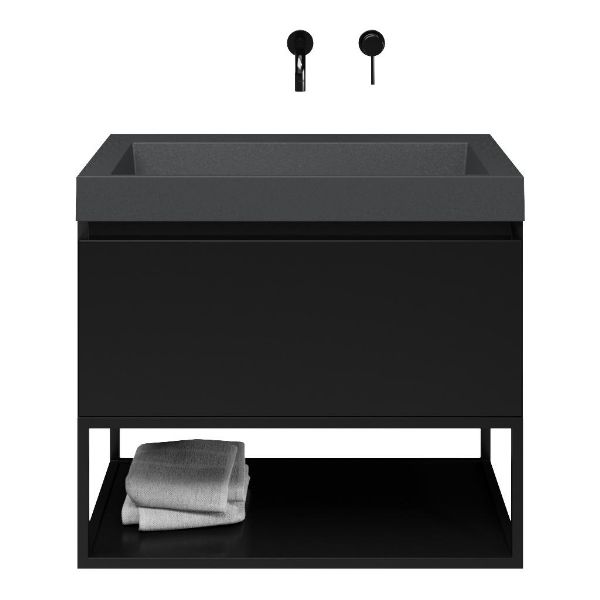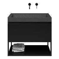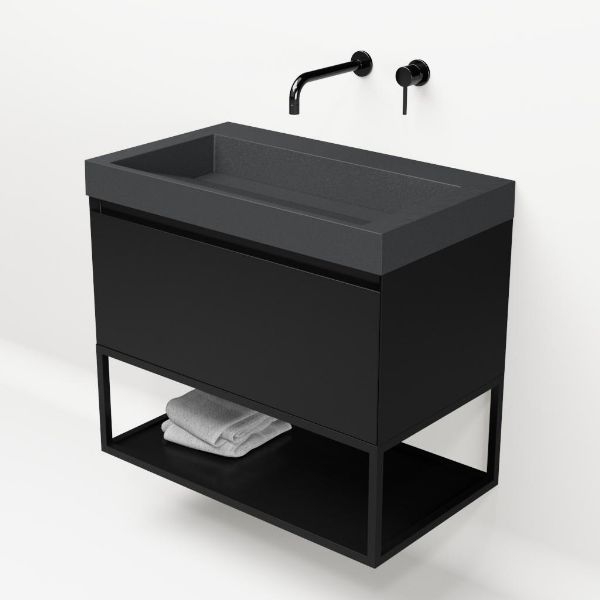 | Bellanti Solo/Tela/Renzo-q badmeubel 80x46 1 softclose lade zwart mat greeploos quartz wastafel mat grijs zonder kraangat met mat zwart metalen frame |