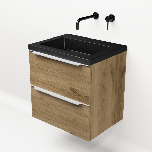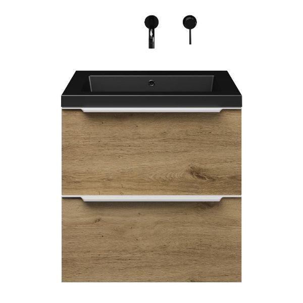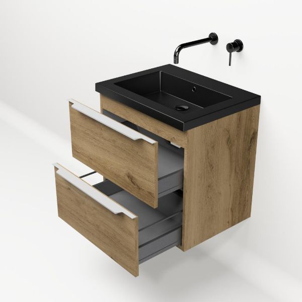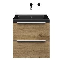 | | Bellanti Lucilla/Esta badmeubel 60x46 2 softclose laden warm eiken met greep naar keuze polystone wastafel mat zwart zonder kraangaten |