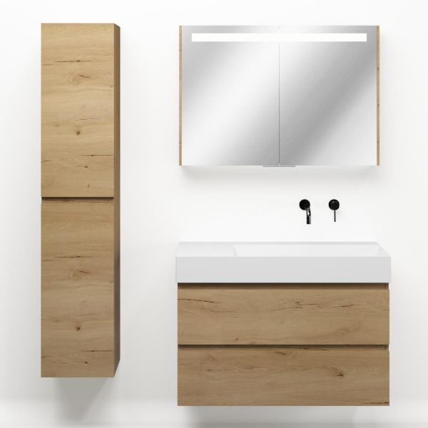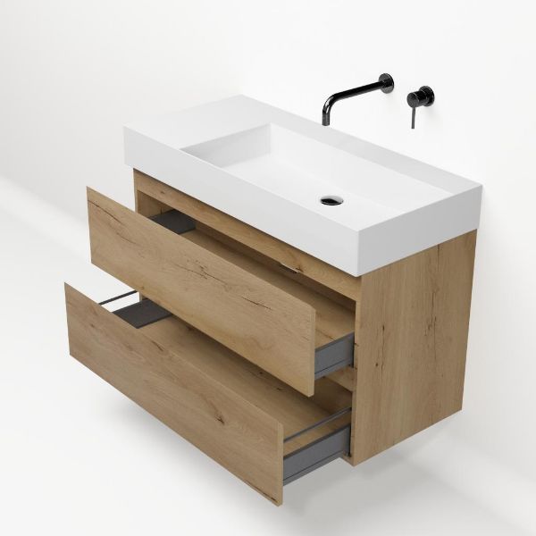 | Bellanti Elena/Azzurra badmeubel 100x46 2 softclose laden eiken natuur greeploos keramische wastafel rechts wit glans zonder kraangat |