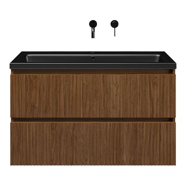 | Bellanti Silvan/Amelia badmeubel 100x46 2 softclose laden met ribbel - latjes structuur warm noten greeploos keramische wastafel zwart mat met 1 kraangaten |