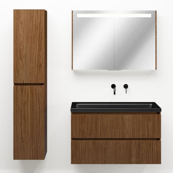 | | Bellanti Silvan/Amelia badmeubel 100x46 2 softclose laden met ribbel - latjes structuur warm noten greeploos keramische wastafel zwart mat met 1 kraangaten |