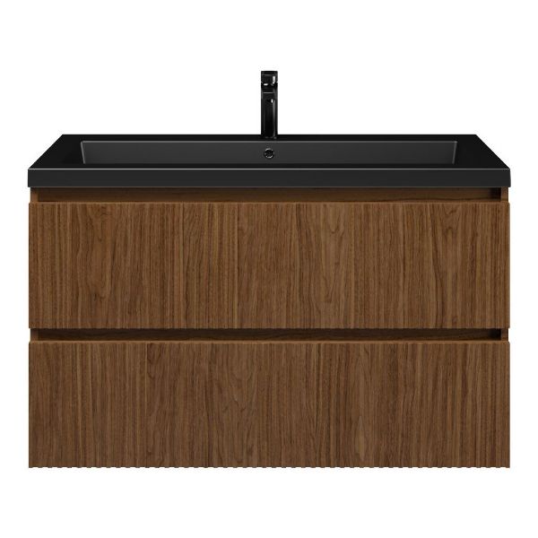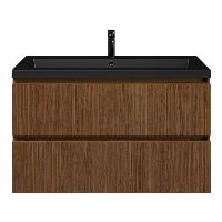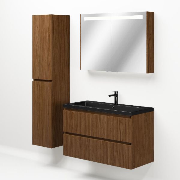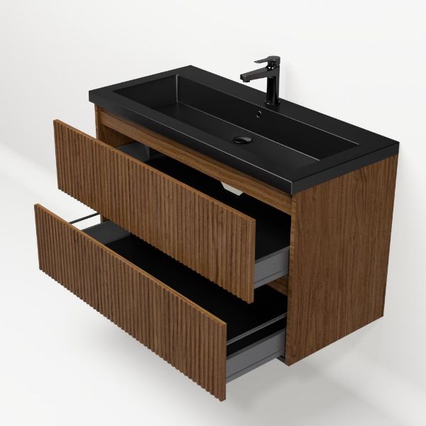 | Bellanti Silvan/Esta badmeubel 100x46 2 softclose laden met ribbel - latjes structuur warm noten greeploos polystone wastafel mat zwart met 1 kraangat |