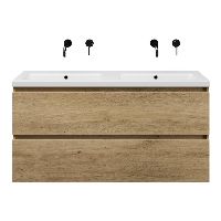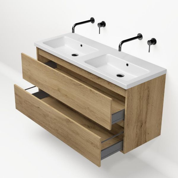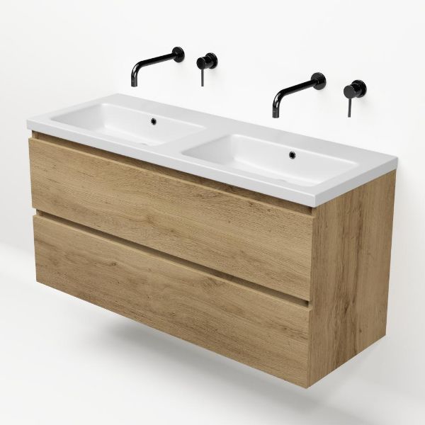 | | Bellanti Fiore /Amelia badmeubel 120x46 2 softclose laden warm eiken greeploos keramische wastafel dubbel wit mat zonder kraangaten |