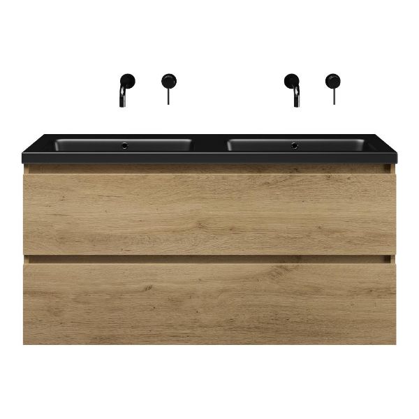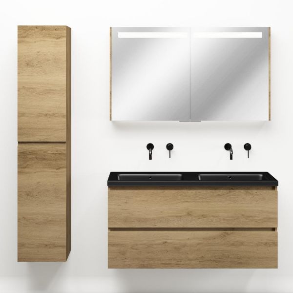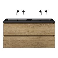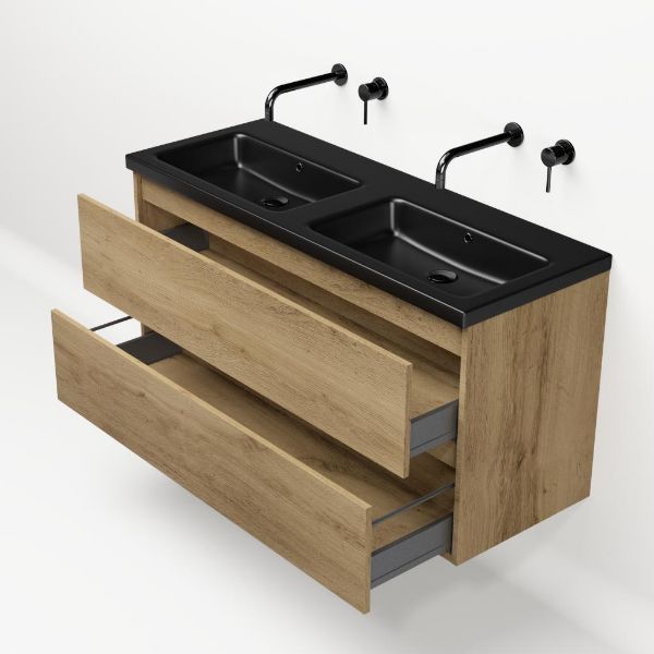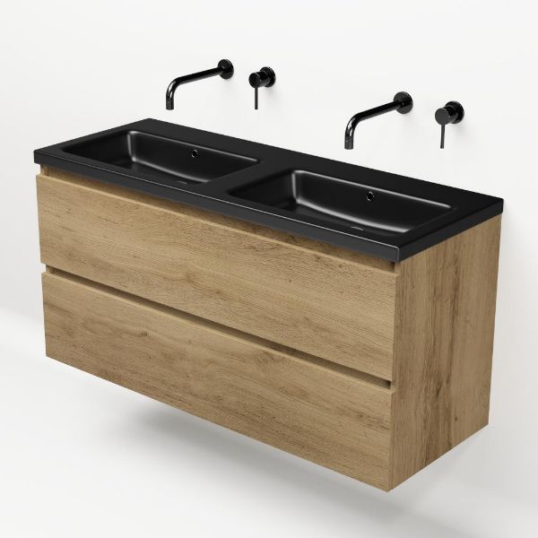 | | Bellanti Fiore /Amelia badmeubel 120x46 2 softclose laden warm eiken greeploos keramische wastafel dubbel zwart mat zonder kraangaten |
