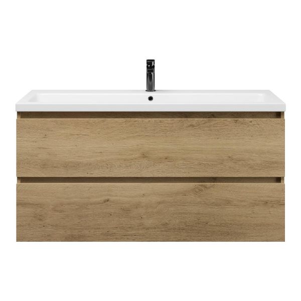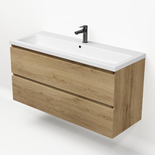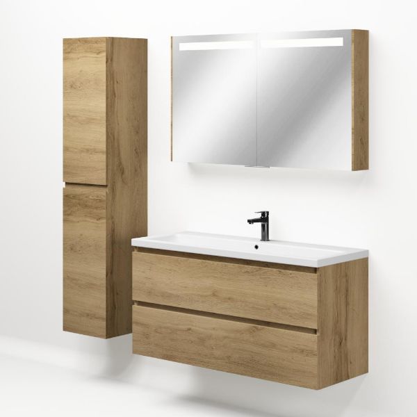 Greeploos badkamermeubel in de kleur eiken warm is 120 cm breed. De wastafel is vervaardig in keramiek en heeft de kleur wit keramiek.