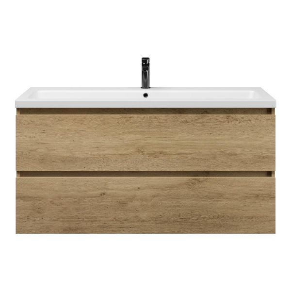 Greeploos badkamermeubel in de kleur eiken warm is 120 cm breed. De wastafel is vervaardig in keramiek en heeft de kleur wit mat keramiek.