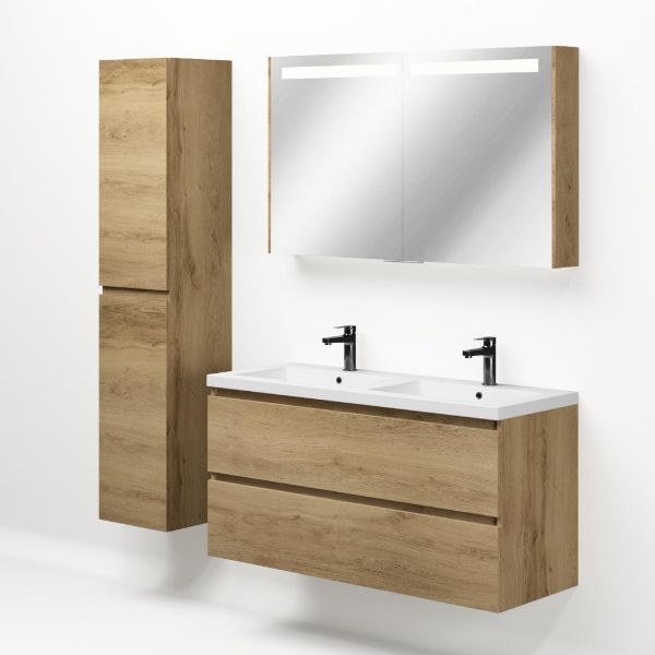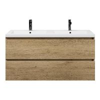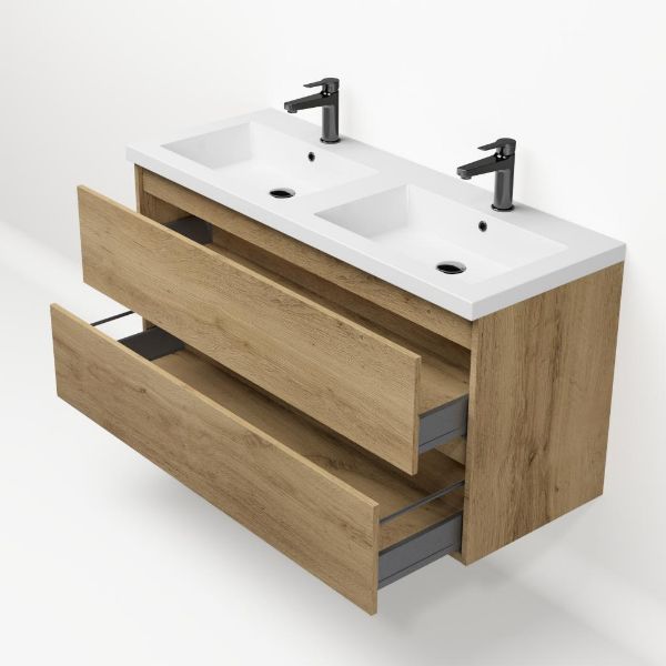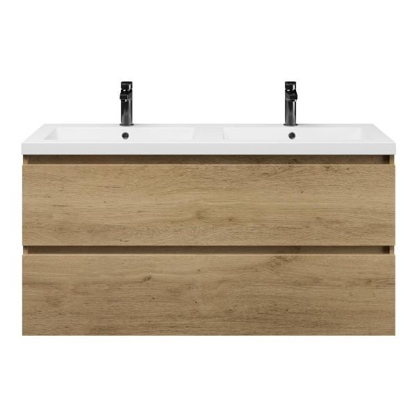 | Bellanti Fiore/Esta badmeubel 120x46 2 softclose laden warm eiken greeploos polystone wastafel dubbel wit met 2 kraangaten |