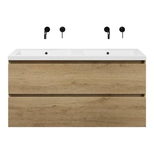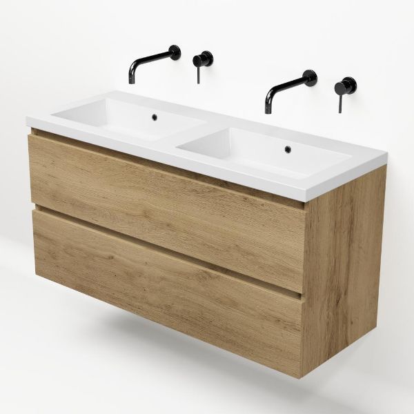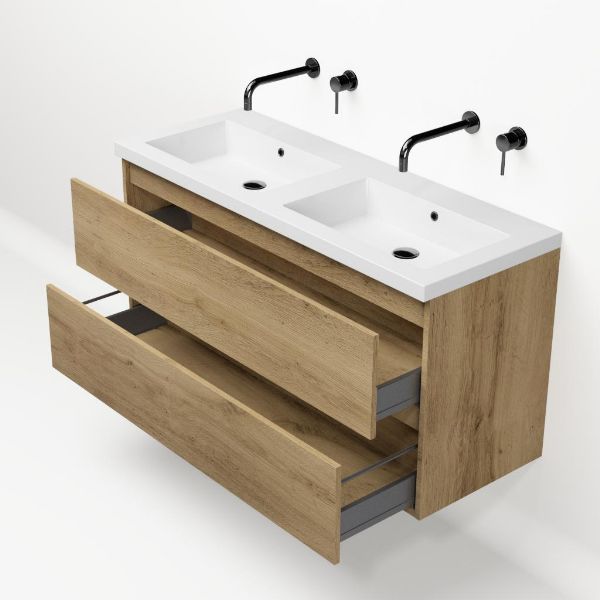 Bellanti Fiore/Esta badmeubel 120x46 2 softclose laden warm eiken greeploos polystone wastafel dubbel wit zonder kraangaten