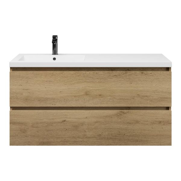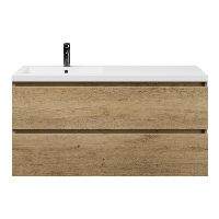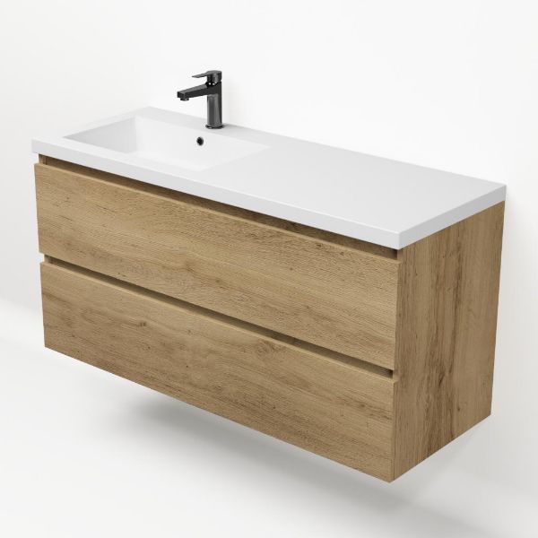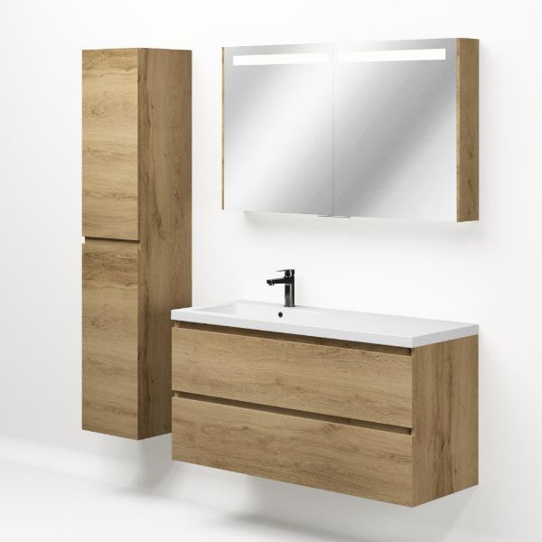 Greeploos badkamermeubel in de kleur eiken warm is 120 cm breed.  De wastafel is vervaardig in polystone en heeft de kleur wit keramiek.
