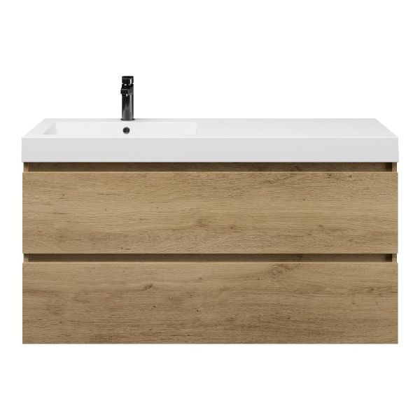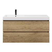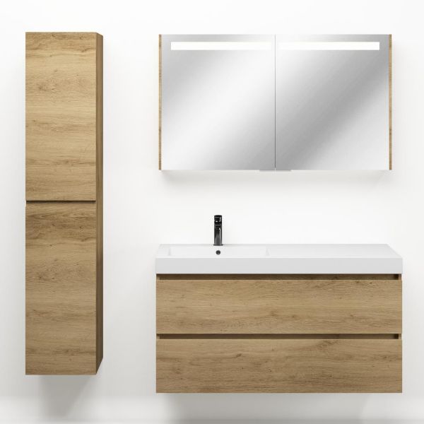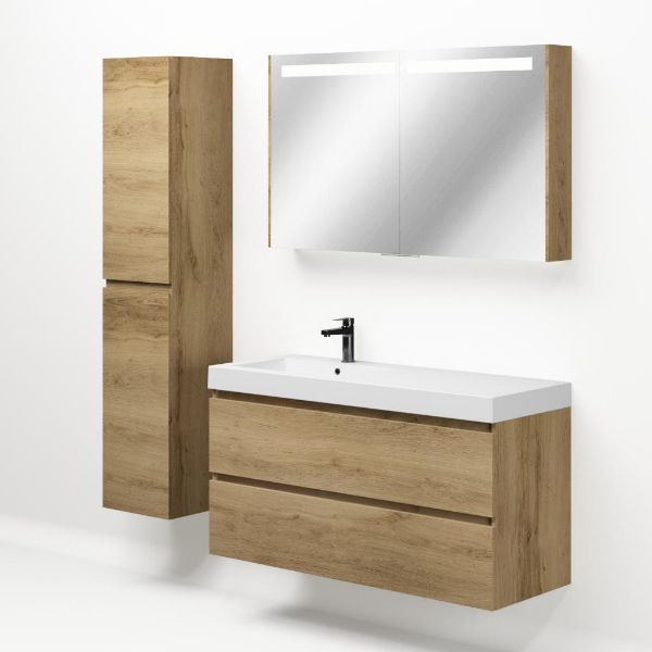Greeploos badkamermeubel in de kleur eiken warm is 120 cm breed. De wastafel is vervaardig in polystone en heeft de kleur wit keramiek.