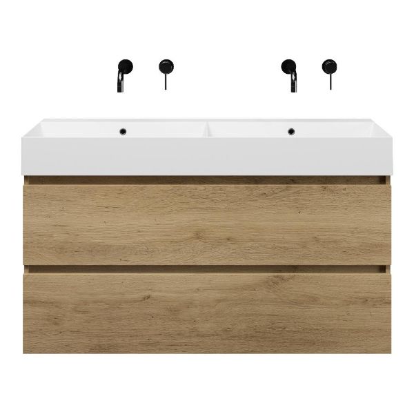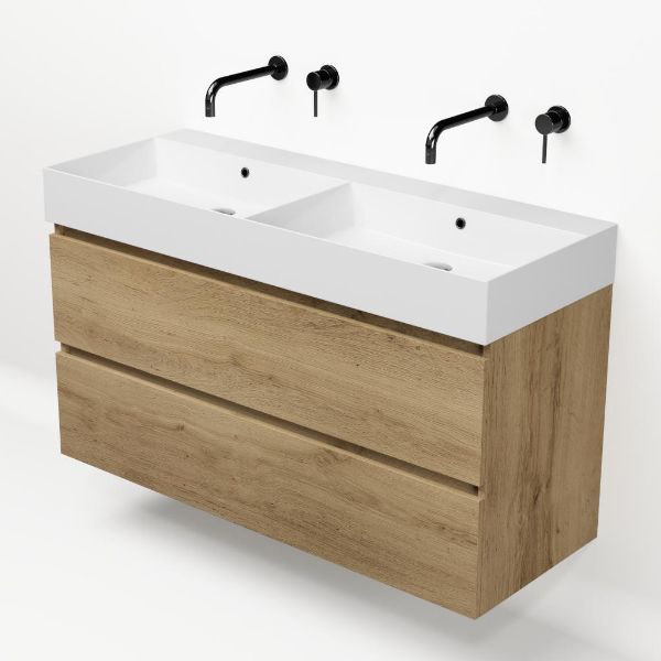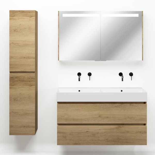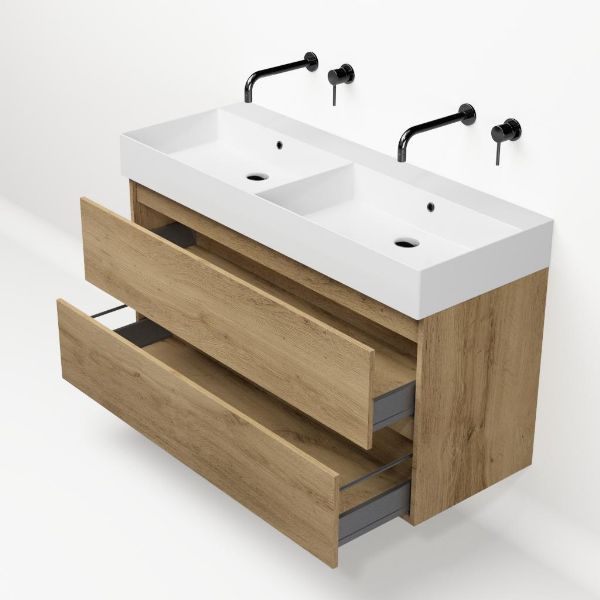 | | Bellanti Fiore/Azzurra badmeubel 120x46 2 softclose laden warm eiken greeploos keramische wastafel dubbel wit glans zonder kraangaten |