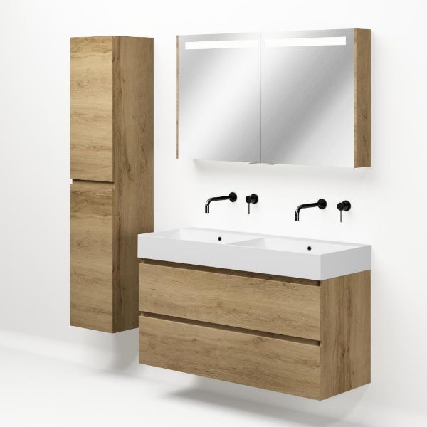 | Bellanti Fiore/Azzurra badmeubel 120x46 2 softclose laden warm eiken greeploos keramische wastafel dubbel wit glans zonder kraangaten |