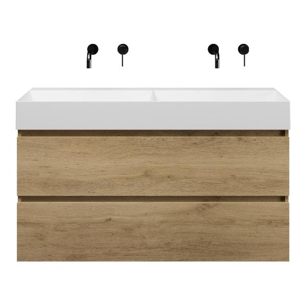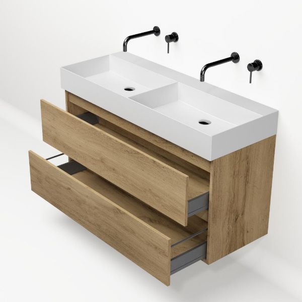 | | Bellanti Fiore/Azzurra badmeubel 120x46 2 softclose laden warm eiken greeploos keramische wastafel dubbel wit mat zonder kraangaten |
