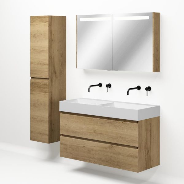 | Bellanti Fiore/Azzurra badmeubel 120x46 2 softclose laden warm eiken greeploos keramische wastafel dubbel wit mat zonder kraangaten |