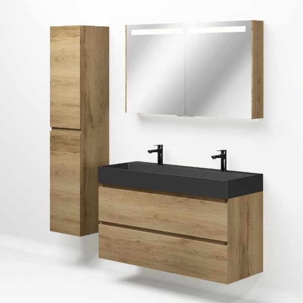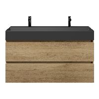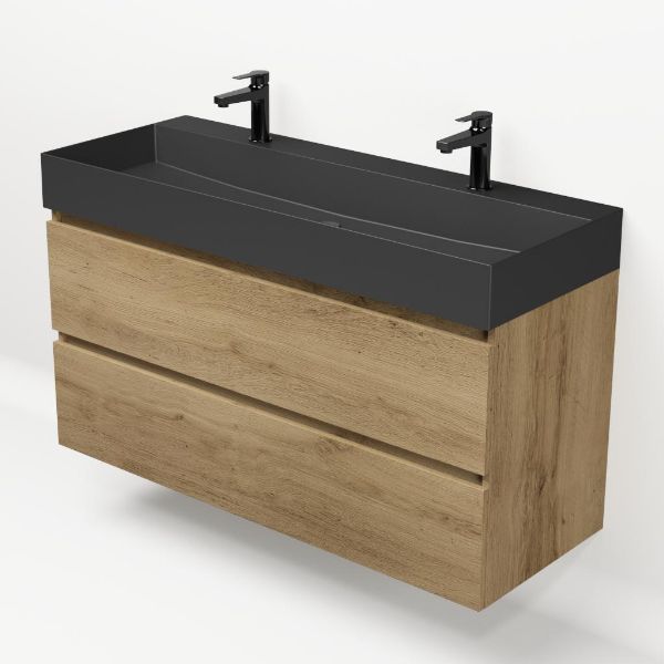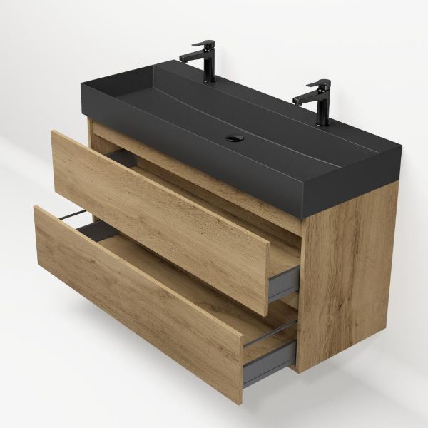 | Bellanti Fiore/Azzurra badmeubel 120x46 2 softclose laden warm eiken greeploos keramische wastafel enkel antraciet mat met 2 kraangaten |