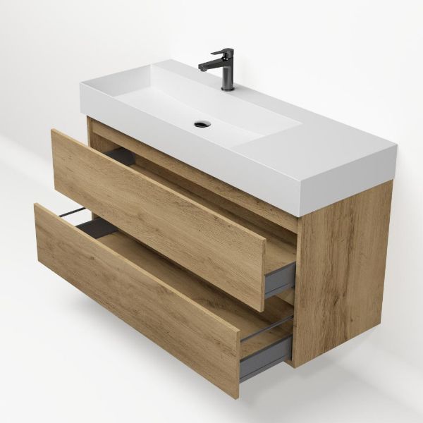 Greeploos badkamermeubel in de kleur eiken warm is 120 cm breed. De wastafel is vervaardig in keramiek en heeft de kleur wit mat keramiek.
