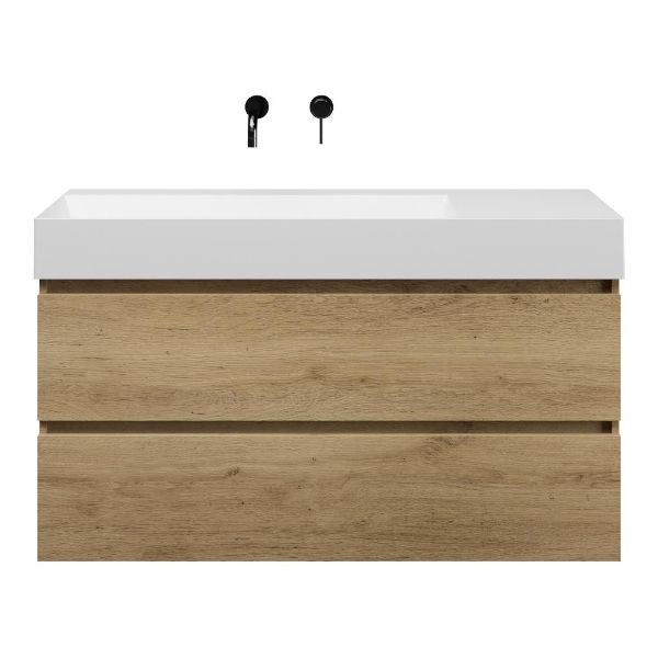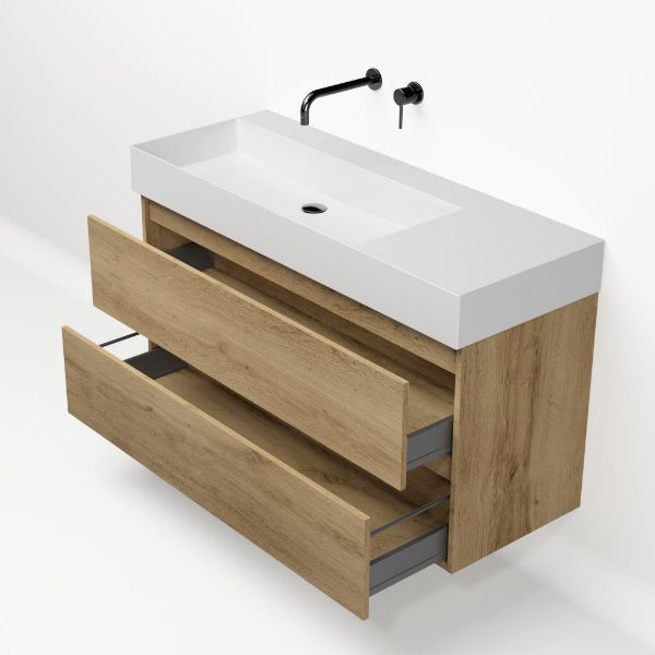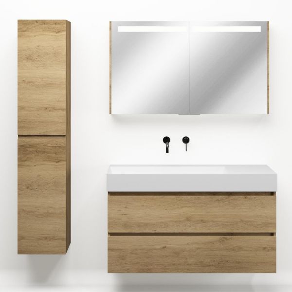 Greeploos badkamermeubel in de kleur eiken warm is 120 cm breed. De wastafel is vervaardig in keramiek en heeft de kleur wit mat keramiek.