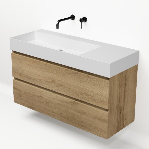 | Bellanti Fiore/Azzurra badmeubel 120x46 2 softclose laden warm eiken greeploos keramische wastafel links wit mat zonder kraangat |