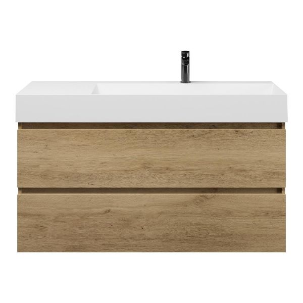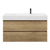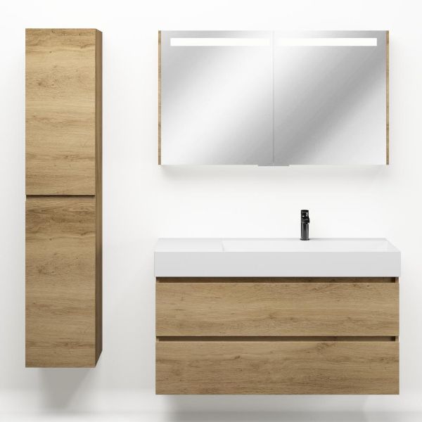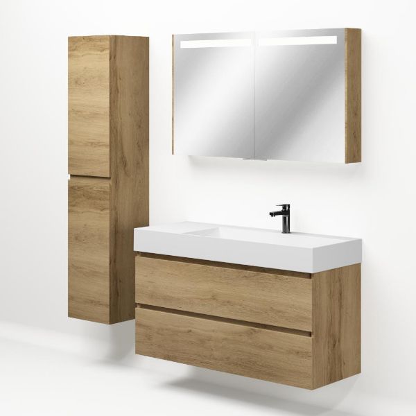 Greeploos badkamermeubel in de kleur eiken warm is 120 cm breed. De wastafel is vervaardig in keramiek en heeft de kleur wit keramiek.