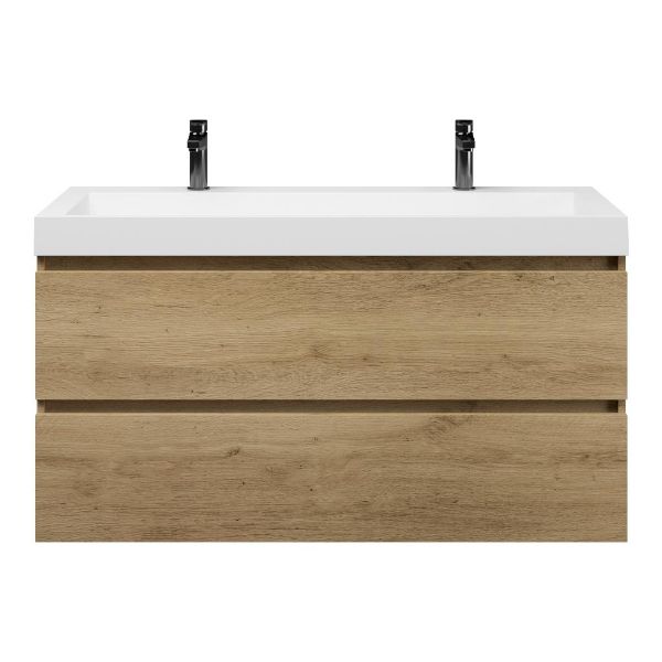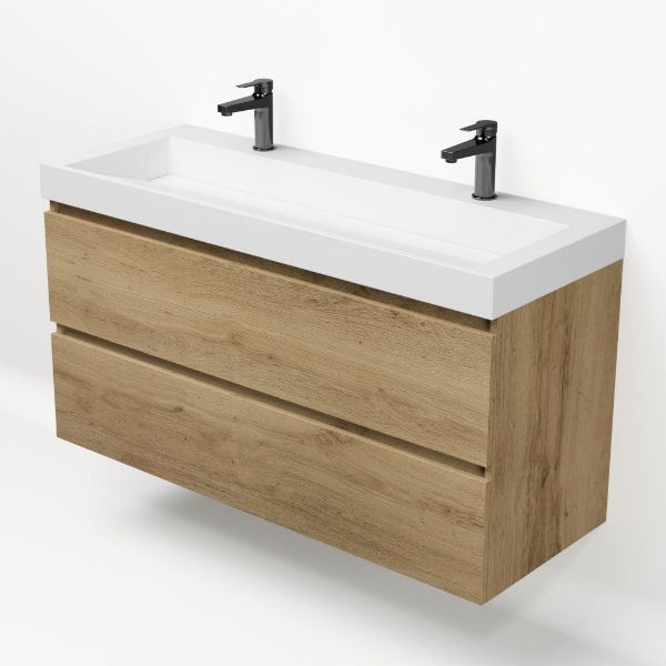 | | Bellanti Fiore /Renzo badmeubel 120x46 2 softclose laden warm eiken greeploos polystone wastafel wit met 2 kraangaten |