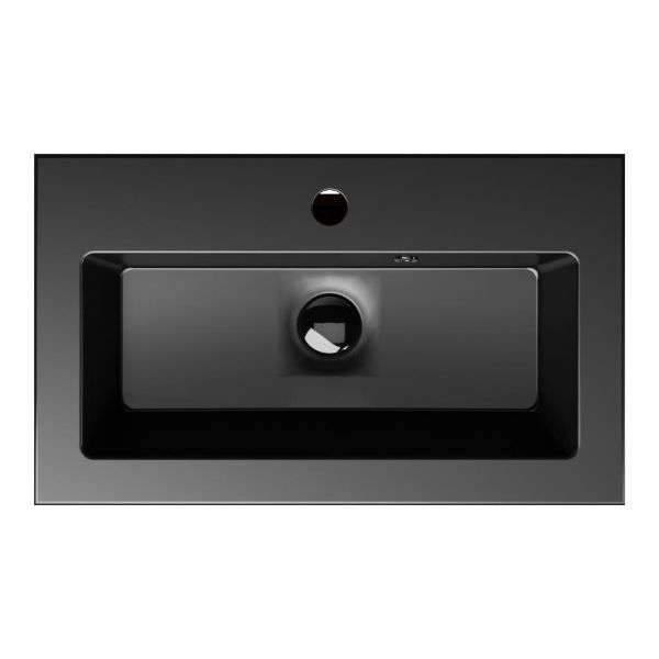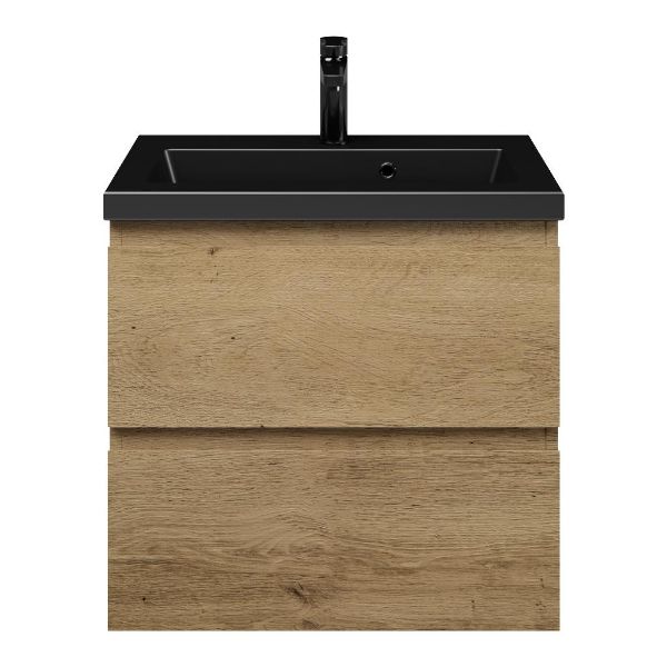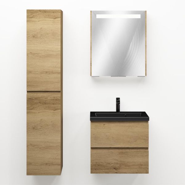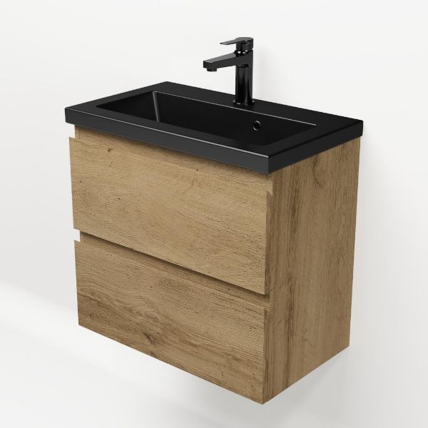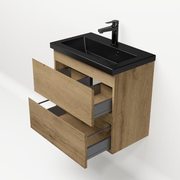 | | Bellanti Secca/Amelia ondiep badmeubel 60x36 2 softclose laden warm eiken greeploos keramische wastafel mat zwart met 1 kraangat |