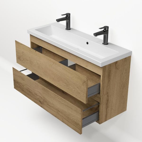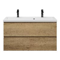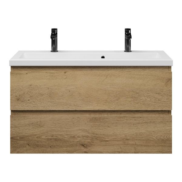 | Bellanti Secca/Amelia ondiep badmeubel 100x36 2 softclose laden warm eiken greeploos keramische wastafel mat wit met 2 kraangaten |