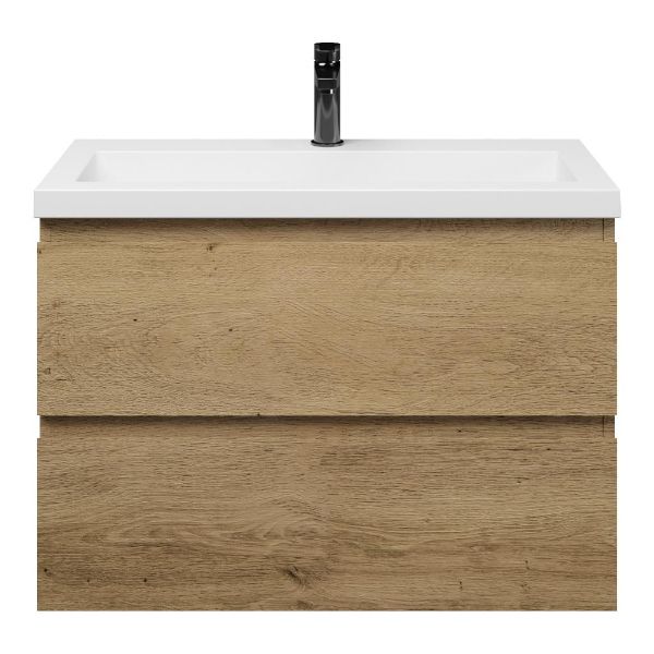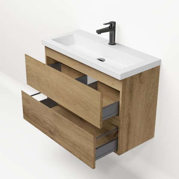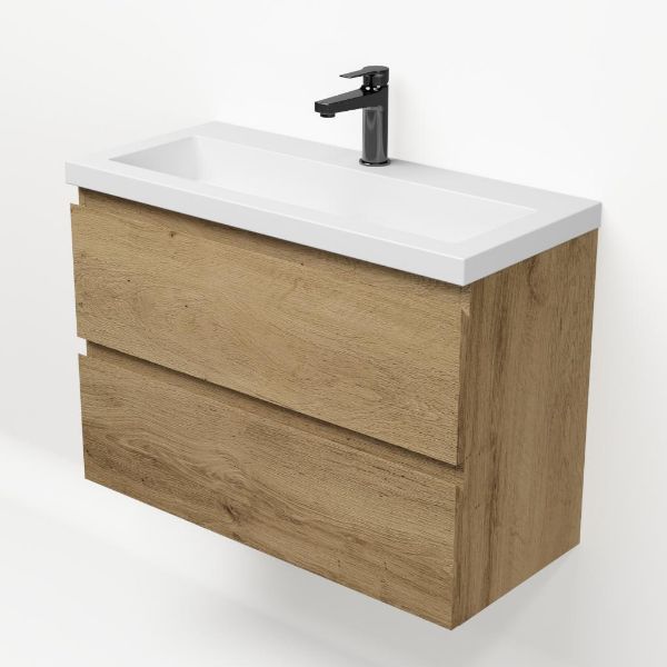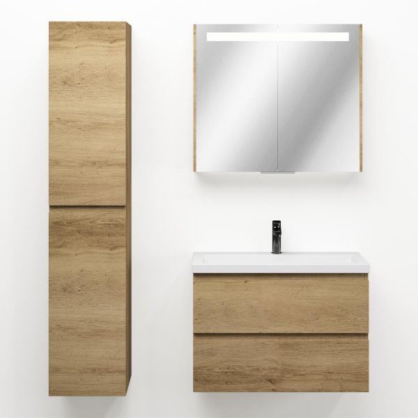 Ondiepe greeploos badkamermeubel in de kleur eiken warm. Badmeubel is praktisch voor een compact badkamer. Het meubel van 80 cm breed is er.  De wastafel is vervaardig in polystone en heeft de kleur wit keramiek. Dit badkamermeubel met deze wastafel is leverbaar tussen de 60 cm t/m 120 cm.