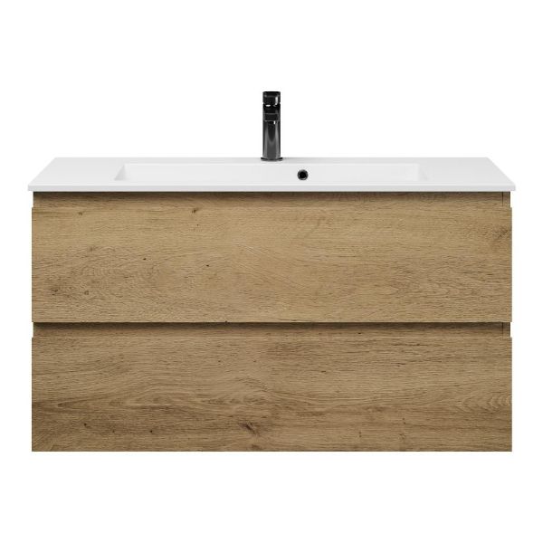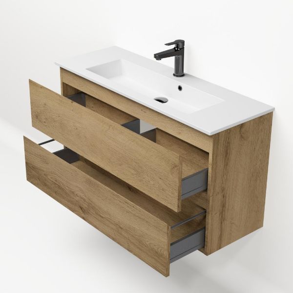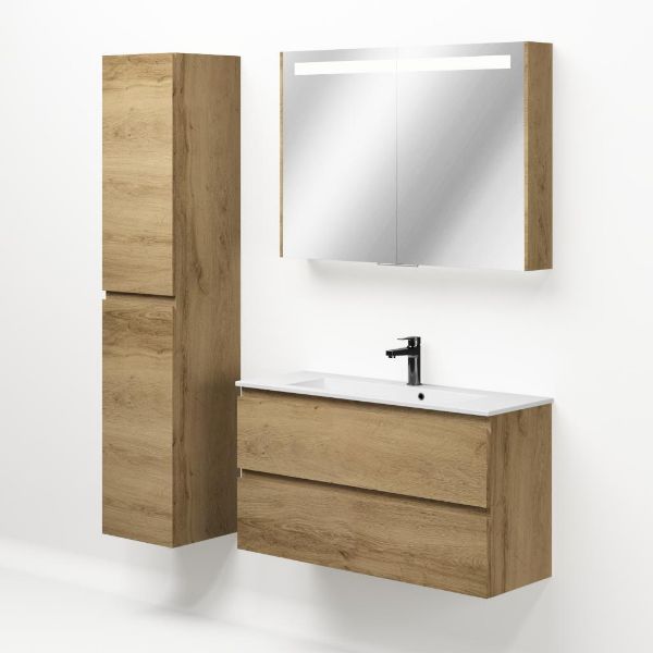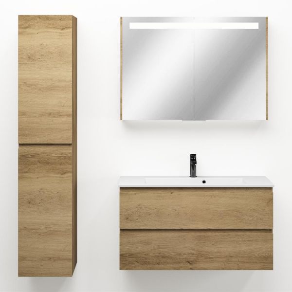 Ondiepe greeploos badkamermeubel in de kleur eiken warm. Badmeubel is praktisch voor een compact badkamer. Het meubel van 100 cm breed is er. De wastafel is vervaardig in keramiek en heeft de kleur wit keramiek. Dit badkamermeubel met deze wastafel is leverbaar tussen de 60 cm t/m 100 cm.