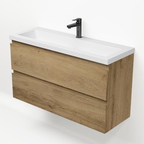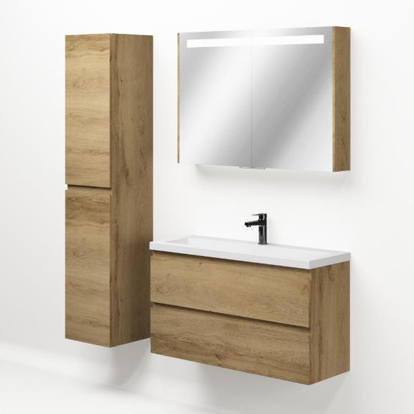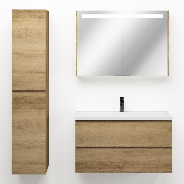 Ondiepe greeploos badkamermeubel in de kleur eiken warm. Badmeubel is praktisch voor een compact badkamer. Het meubel van 100 cm breed is er. De wastafel is vervaardig in polystone en heeft de kleur wit keramiek. Dit badkamermeubel met deze wastafel is leverbaar tussen de 60 cm t/m 120 cm.