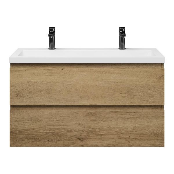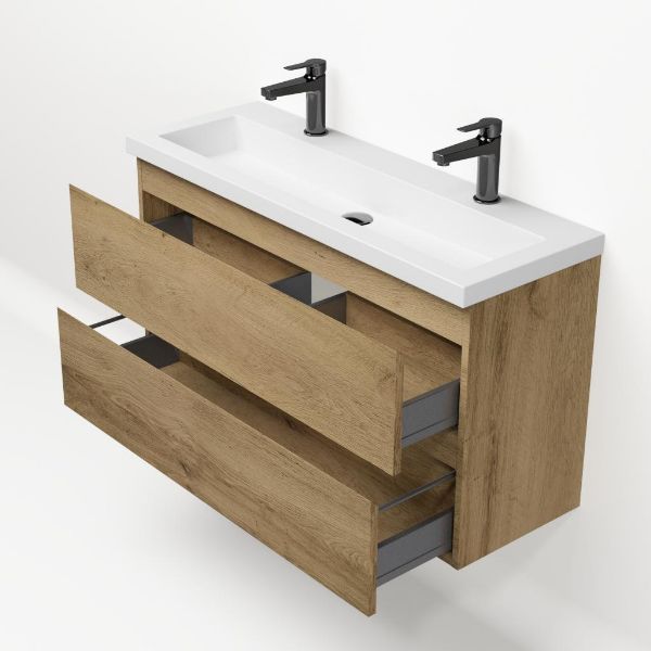 | | Bellanti Secca/Esta ondiep badmeubel 100x36 2 softclose laden warm eiken greeploos polystone wastafel wit met 2 kraangaten |