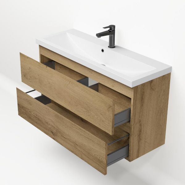 | | Bellanti Secca/Lidia ondiep badmeubel 100x36 2 softclose laden warm eiken greeploos polystone wastafel wit met 1 kraangat |