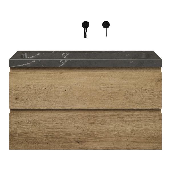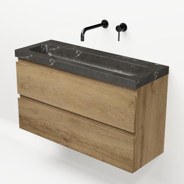 | Bellanti Secca/Stone ondiep badmeubel 100x36 2 softclose laden warm eiken greeploos natuurstenen wastafel bluestone met 0 kraangaten |