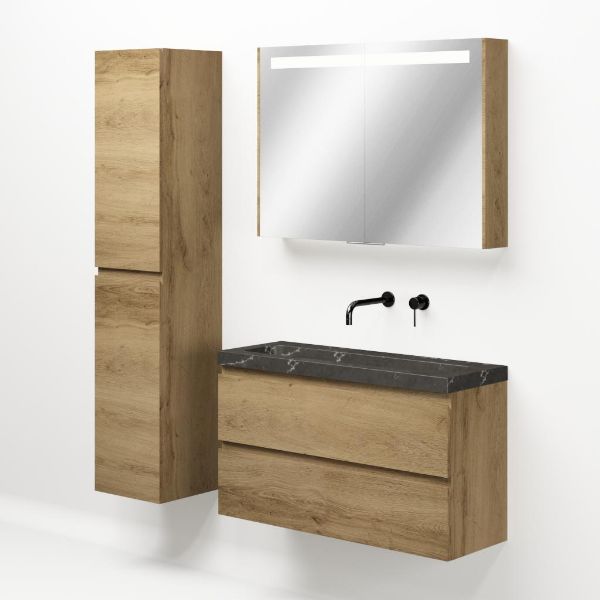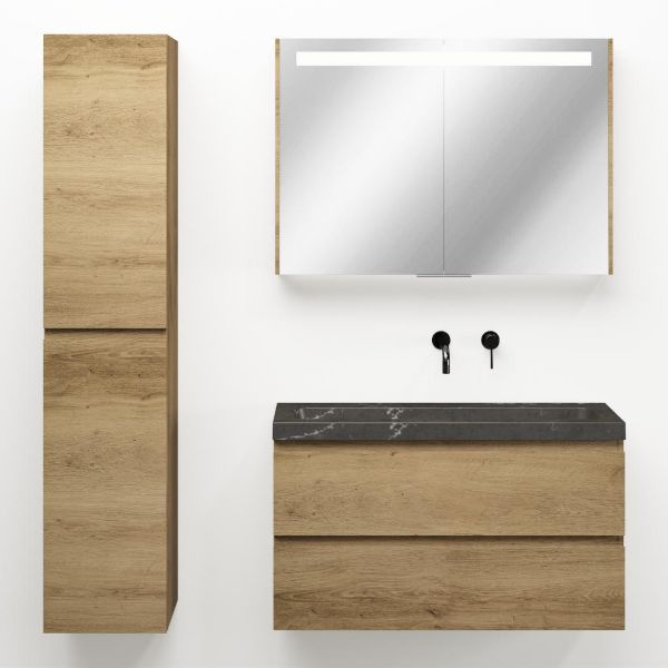 Ondiepe greeploos badkamermeubel in de kleur eiken warm. Badmeubel is praktisch voor een compact badkamer. Het meubel van 100 cm breed is er. De wastafel is vervaardig in natuursteen en heeft de kleur blue stone. Dit badkamermeubel met deze wastafel is leverbaar tussen de 60 cm t/m 100 cm.