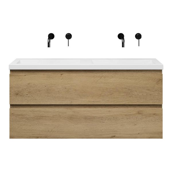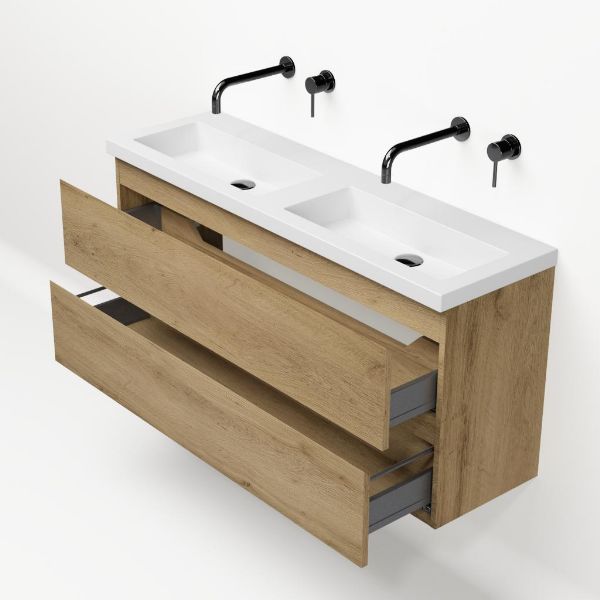 | Bellanti Secca/Esta ondiep badmeubel 120x36 2 softclose laden warm eiken greeploos polystone wastafel dubbel wit zonder kraangaten |