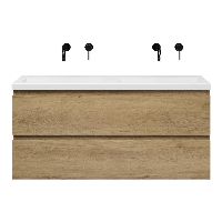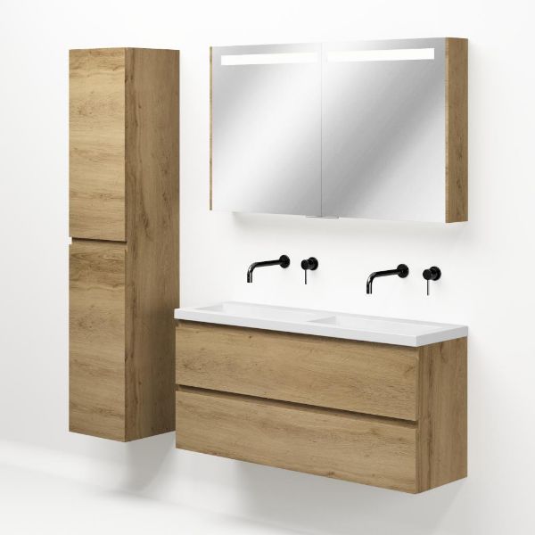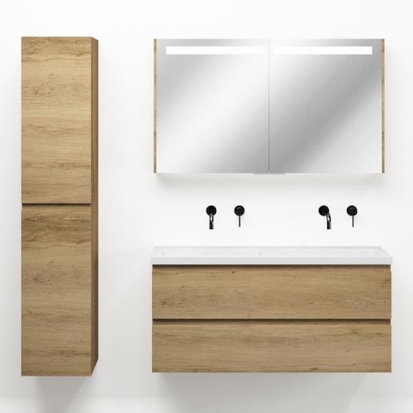 | | Bellanti Secca/Esta ondiep badmeubel 120x36 2 softclose laden warm eiken greeploos polystone wastafel dubbel wit zonder kraangaten |