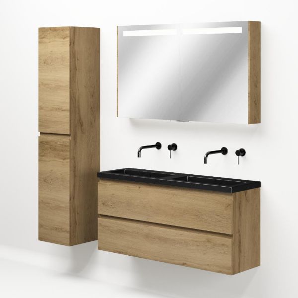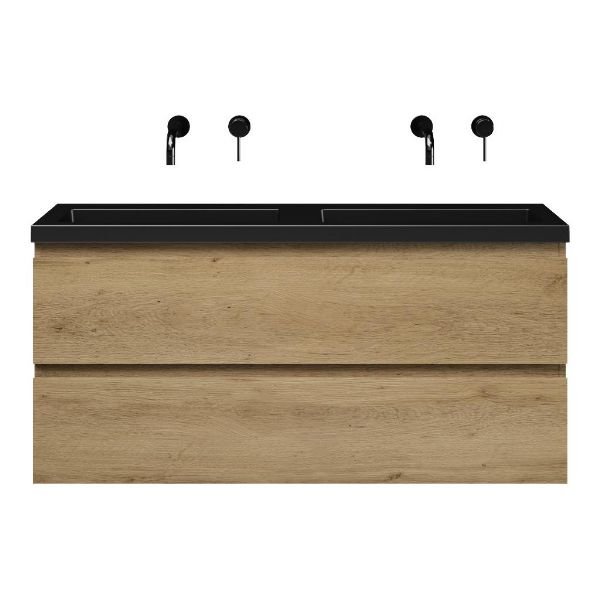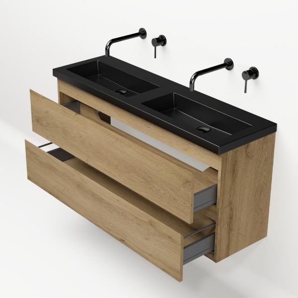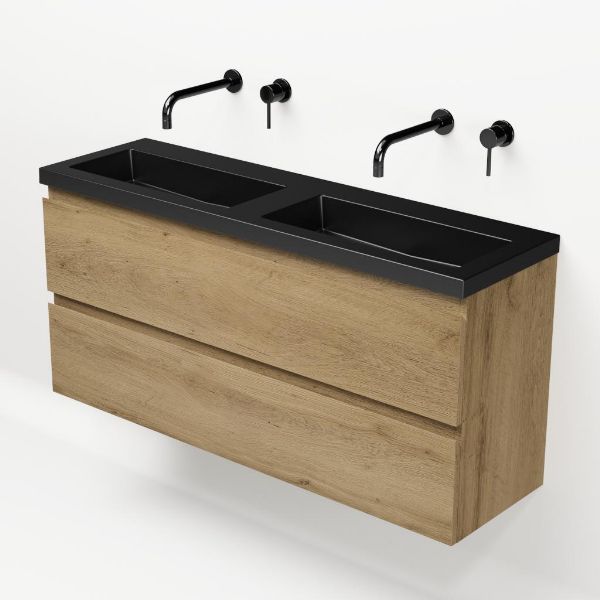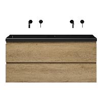 | | Bellanti Secca/Esta ondiep badmeubel 120x36 2 softclose laden warm eiken greeploos polystone wastafel dubbel mat zwart zonder kraangaten |