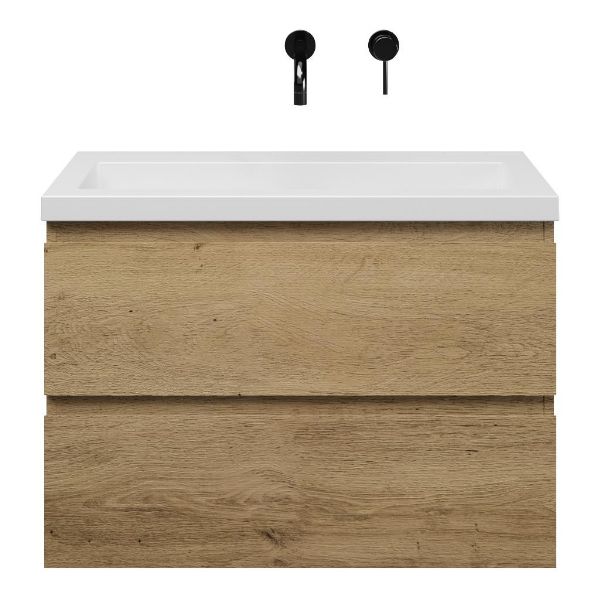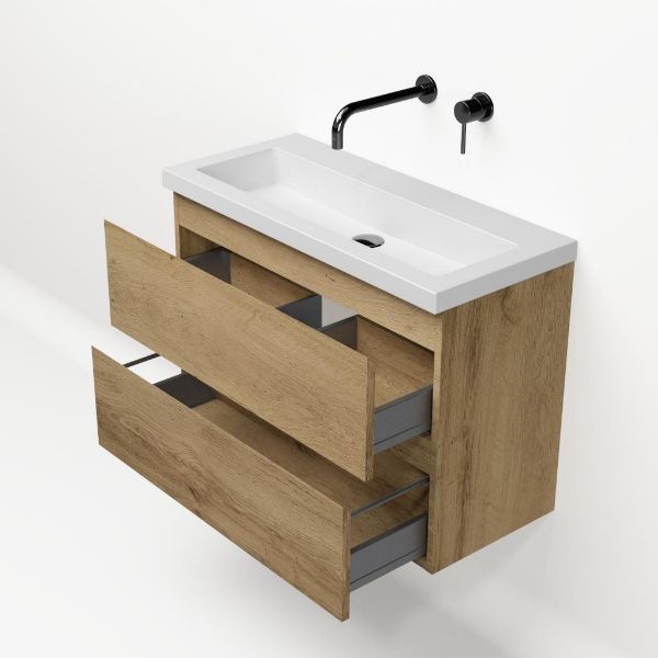 Ondiepe greeploos badkamermeubel in de kleur eiken warm. Badmeubel is praktisch voor een compact badkamer. Het meubel van 80 cm breed is er. De wastafel is vervaardig in quartz en heeft de kleur wit mat quartz. Dit badkamermeubel met deze wastafel is leverbaar tussen de 60 cm t/m 120 cm.