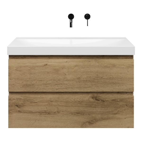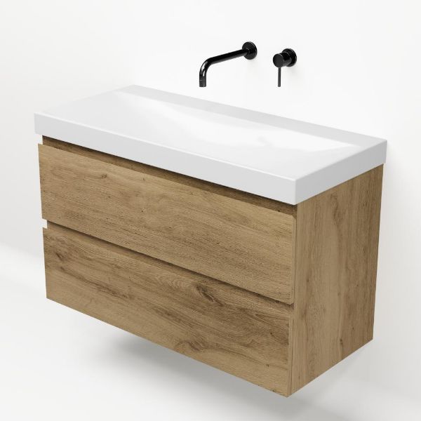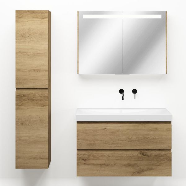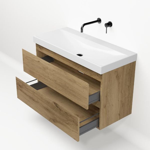 Greeploos badkamermeubel in de kleur eiken warm is 100 cm breed.  De wastafel is vervaardig in keramiek en heeft de kleur wit glans. Dit badkamermeubel met deze wastafel is leverbaar in 100 cm.