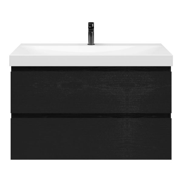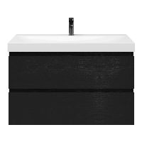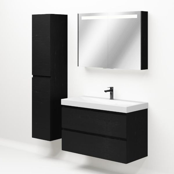 Greeploos badkamermeubel in de kleur zwart mat eiken is 100 cm breed.  De wastafel is vervaardig in keramiek en heeft de kleur wit glans. Dit badkamermeubel met deze wastafel is leverbaar in 100 cm.