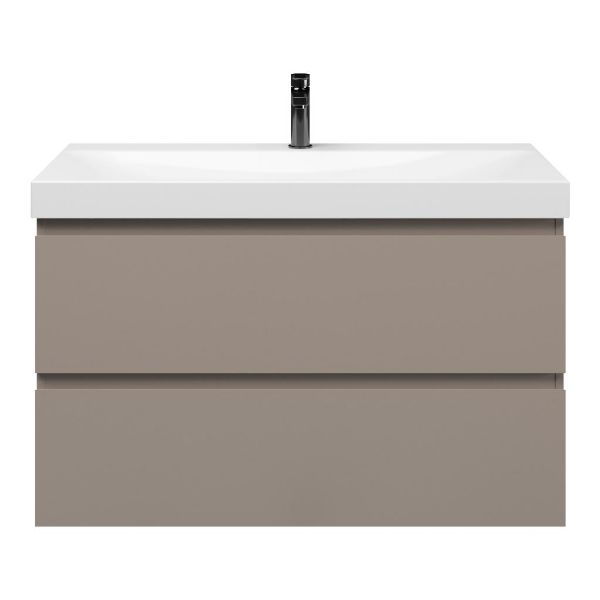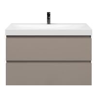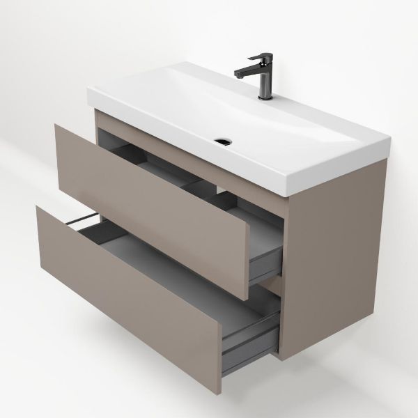 Greeploos badkamermeubel in de kleur taupe is 100 cm breed.  De wastafel is vervaardig in keramiek en heeft de kleur wit glans. Dit badkamermeubel met deze wastafel is leverbaar in 100 cm.