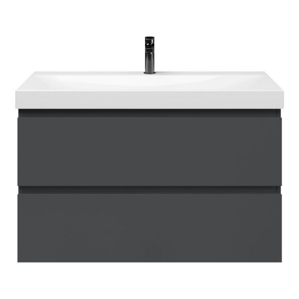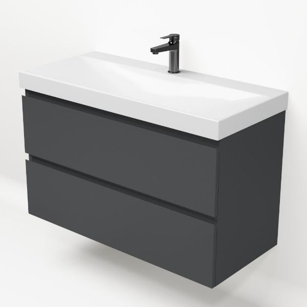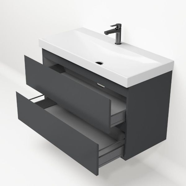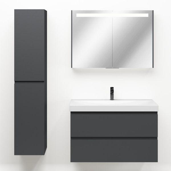 Greeploos badkamermeubel in de kleur antraciet mat is 100 cm breed.  De wastafel is vervaardig in keramiek en heeft de kleur wit glans. Dit badkamermeubel met deze wastafel is leverbaar in 100 cm.