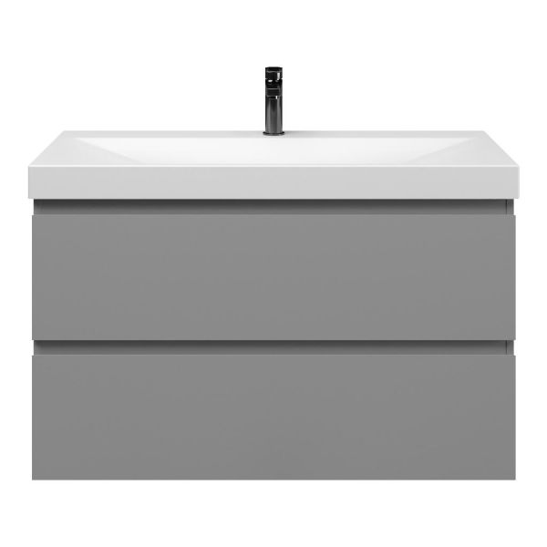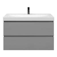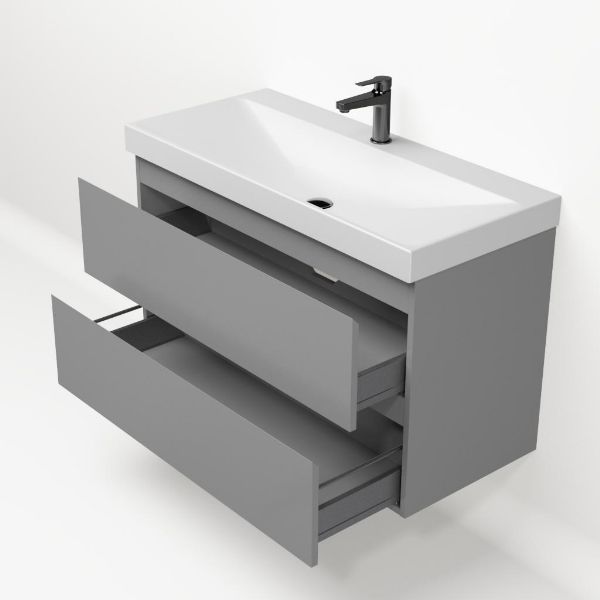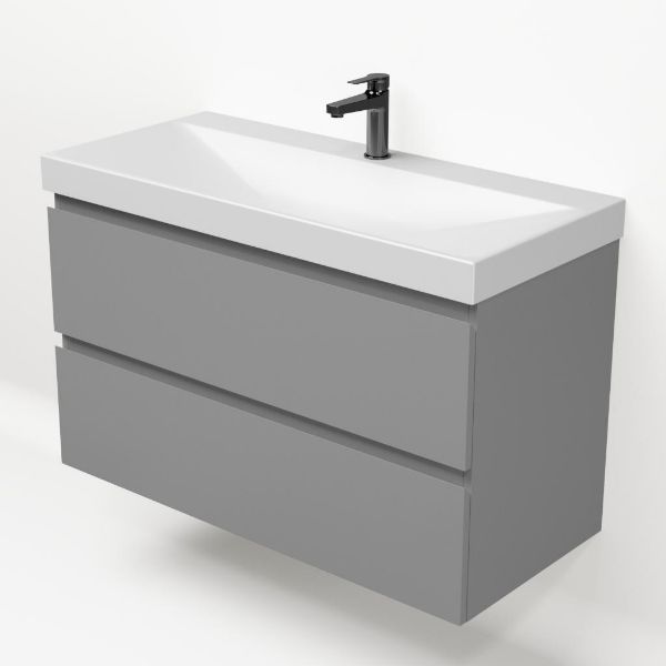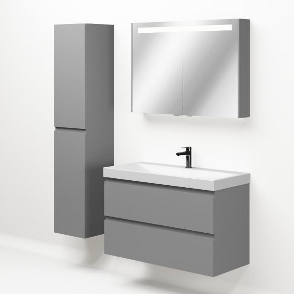 Greeploos badkamermeubel in de kleur licht grijs mat is 100 cm breed.  De wastafel is vervaardig in keramiek en heeft de kleur wit mat. Dit badkamermeubel met deze wastafel is leverbaar in 100 cm.