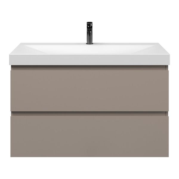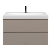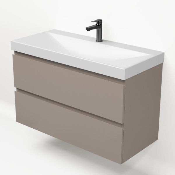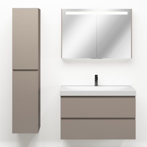 Greeploos badkamermeubel in de kleur taupe is 100 cm breed.  De wastafel is vervaardig in keramiek en heeft de kleur wit mat. Dit badkamermeubel met deze wastafel is leverbaar in 100 cm.