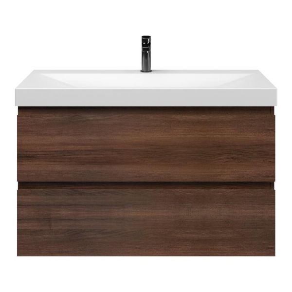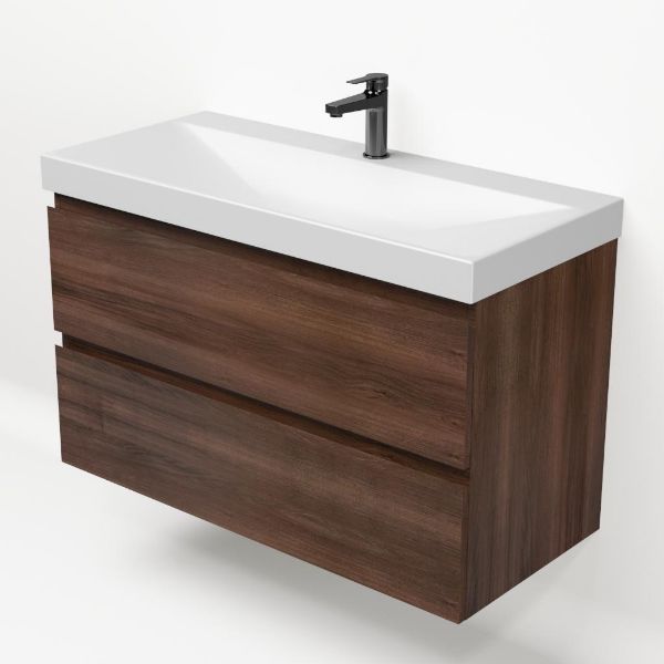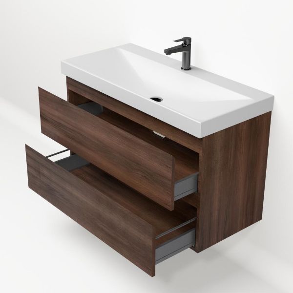 Greeploos badkamermeubel in de kleur walnoot is 100 cm breed.  De wastafel is vervaardig in keramiek en heeft de kleur wit mat. Dit badkamermeubel met deze wastafel is leverbaar in 100 cm.