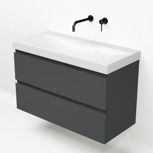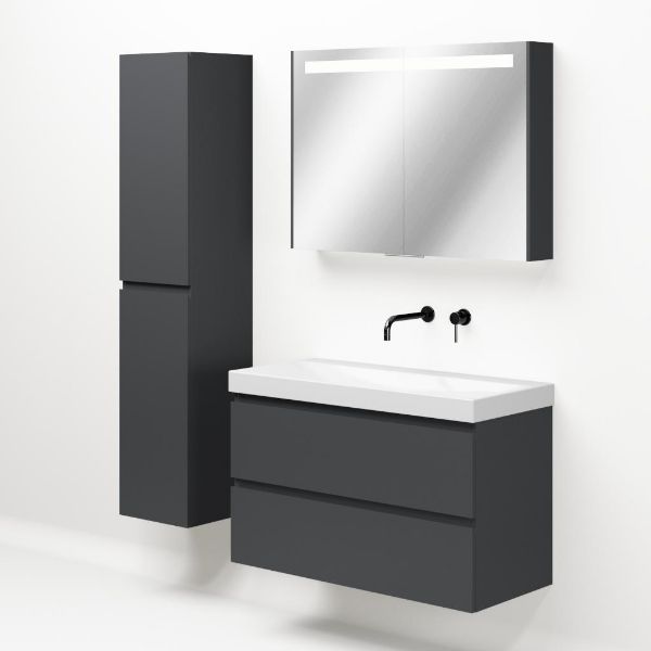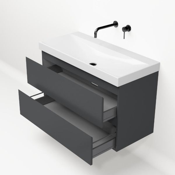 Greeploos badkamermeubel in de kleur antraciet mat is 100 cm breed.  De wastafel is vervaardig in keramiek en heeft de kleur wit glans. Dit badkamermeubel met deze wastafel is leverbaar in 100 cm.