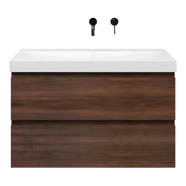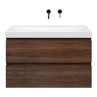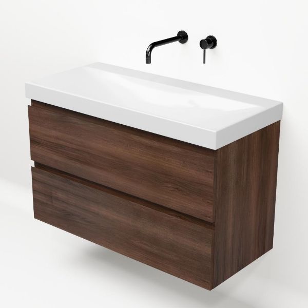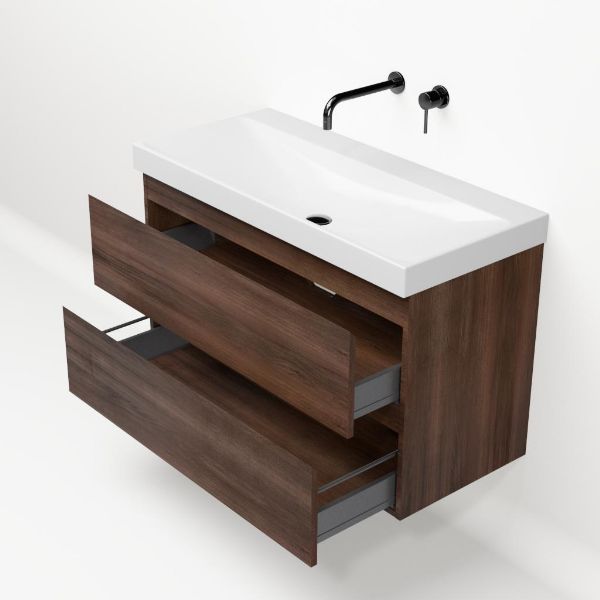 Greeploos badkamermeubel in de kleur walnoot is 100 cm breed.  De wastafel is vervaardig in keramiek en heeft de kleur wit glans. Dit badkamermeubel met deze wastafel is leverbaar in 100 cm.