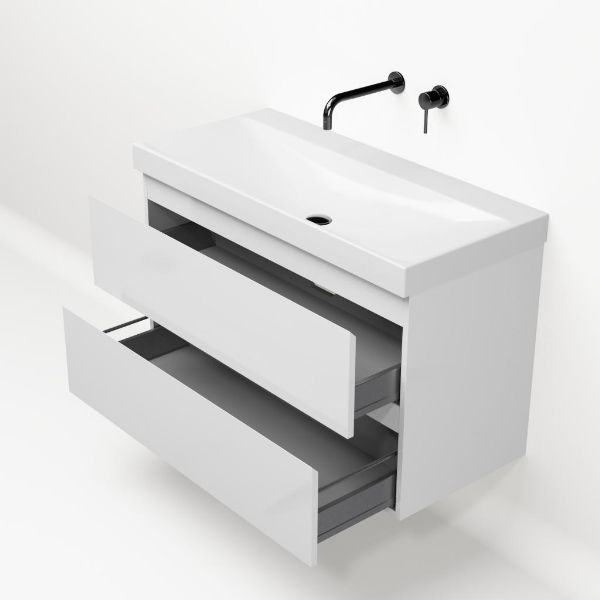 Greeploos badkamermeubel in de kleur wit hoogglans is 100 cm breed.  De wastafel is vervaardig in keramiek en heeft de kleur wit glans. Dit badkamermeubel met deze wastafel is leverbaar in 100 cm.